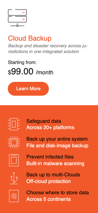 Maintain your system’s backup and disaster recovery across jurisdictions with ALTERNcloud’s Cloud Backup service. With our single integrated solution, we can detect 20+ platforms (Windows, Mac, Linux, etc.) so your business can safeguard data across physical, virtual, cloud and mobile environments. Choose whether to back up individual files or safeguard your entire business by backing up the whole system as a single file, ensuring a bare metal restore capability by utilizing ALTERNcloud multi-Clouds. Cloud Backups also come with built-in malware scanning and allow you to select the location of the Tier-IV-designed, SSAE-18-compliant data center where your data is stored across five continents. Learn more.