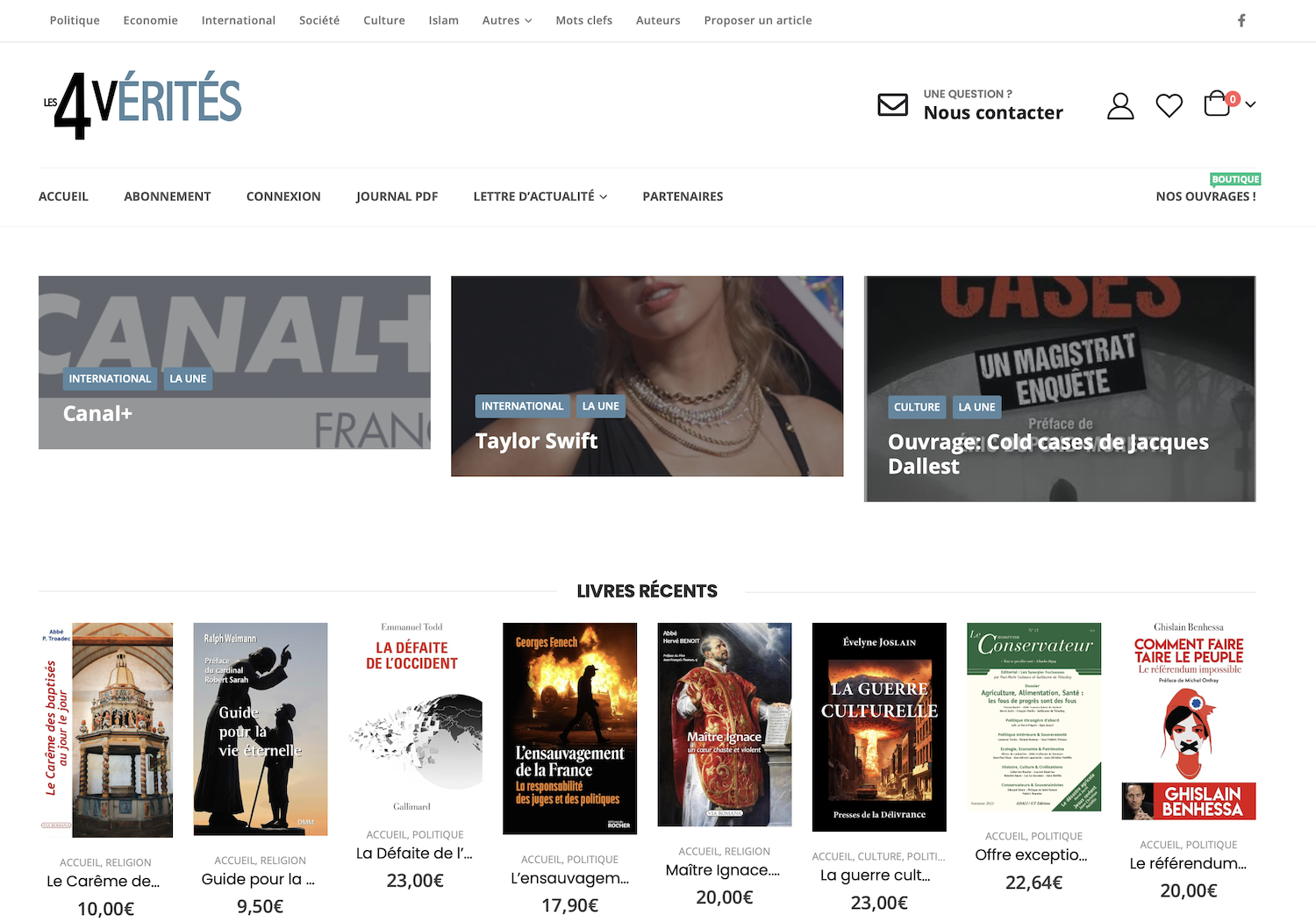 Recognized as one of France’s most popular weekly news publications, Les 4 Vérités describes itself as “La publication anti bourrage de crane,” which translates to: “The weekly publication against brainwashing.” Currently, Les 4 Vérités covers a variety of topics and issues including political, economic, international, cultural, and religious news, among others. The site is owned and operated by Guillaume de Thieulloy, who holds a PhD in political science and participated in a research fellowship at the DeNicola Center for Ethics and Culture at Notre Dame University, and is a former staffer in the French Senate.